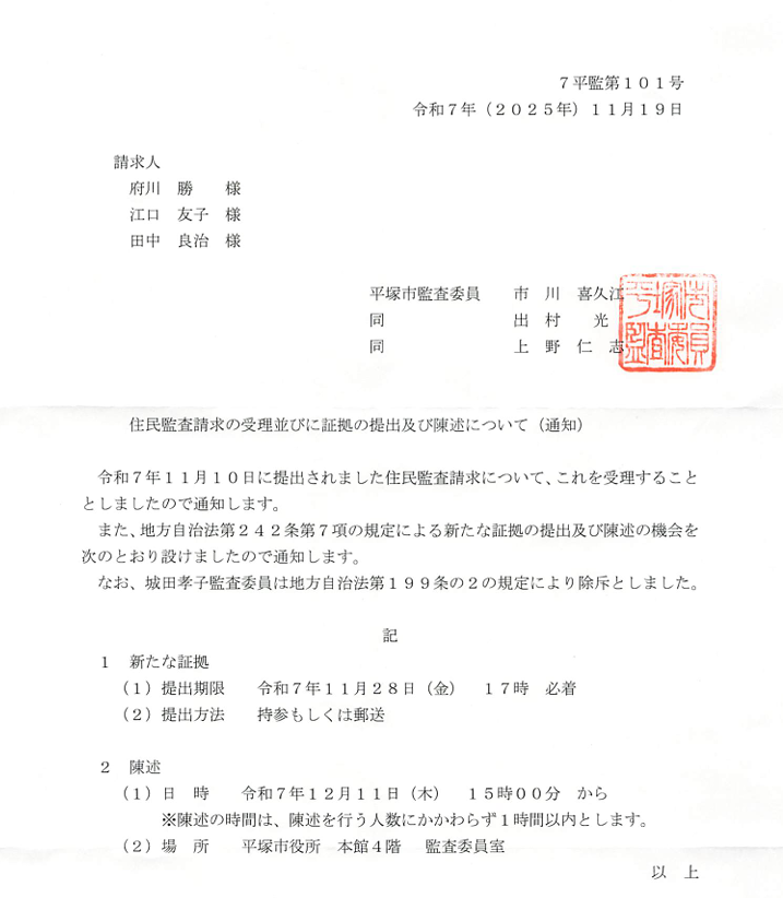 2025年12月11日(木)平塚市役所において、住民監査請求の第3弾に関する「意見陳述」が行われました。発言の要旨などは追って掲載をしていきます。傍聴席が満員となりましたことを取り急ぎお礼申し上げます。ありがとうございました。