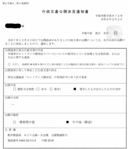 平塚市に対し、事業計画、特に収支部分について情報公開請求を行いましたが、残念ながらほとんど箇所が黒塗りとなり、いわゆる「のり弁」回答となりました。